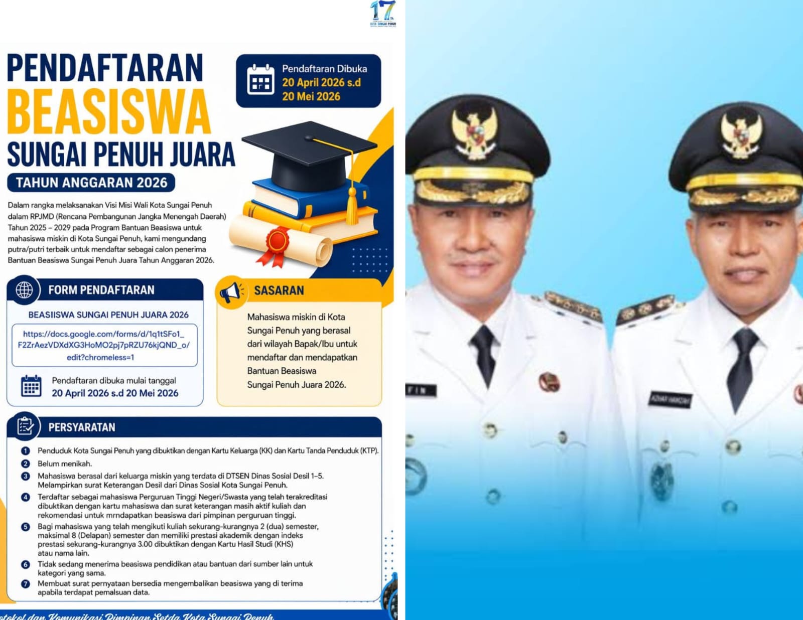 Update Merah Putih, Wujud kepedulian daerah terhadap kelangsung pendidikan, Walikota Sungai Penuh Alfin, SH dan Wakil Walikota Azhar Hamzah Secara resmi membuka pendaftaran Program Beasiswa Sungai Penuh Juara Tahun Anggaran 2026.