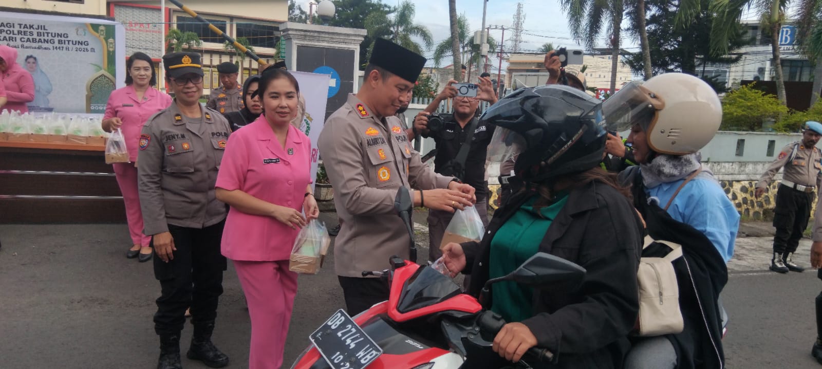 Kegiatan pembagian takjil tersebut dipimpin langsung oleh Kapolres Bitung, Albert Zai, didampingi Ketua Cabang Bhayangkari Bitung Ny. Detta Albert Zai. Turut hadir Wakapolres Bitung J.H. Daniel Korompis, S.E, para Pejabat Utama, personel Polres Bitung, serta pengurus Bhayangkari Cabang Bitung.